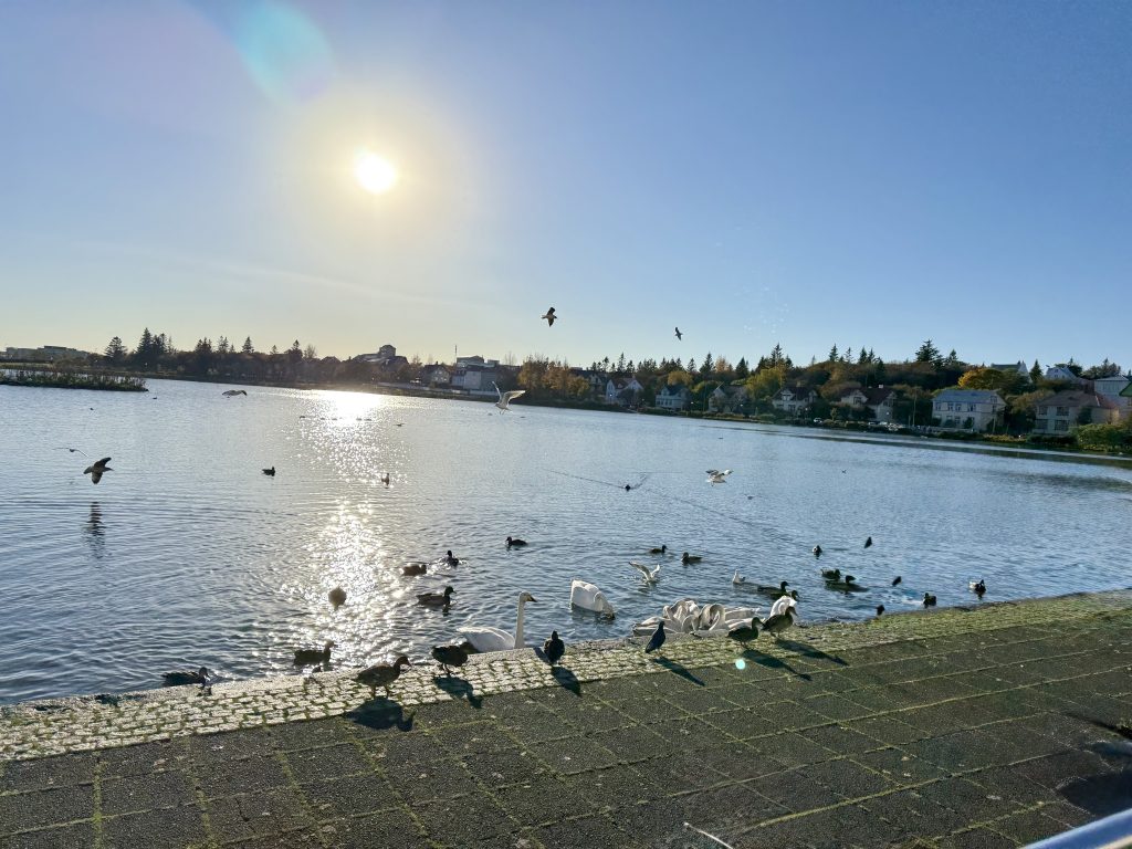 アイスランドの国会議事堂の近隣にあるチョルトニン湖では、白鳥やカモなど多様な水鳥が優雅に泳いでいました。