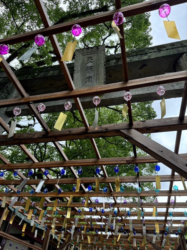 次に奥へ進むと、風鈴飾りが境内に設置されており、その下をくぐり抜けて風鈴の涼しげな音色を楽しみました。なお、8月下旬までの設置期間中は夜間照明を19時から21時まで行っています。