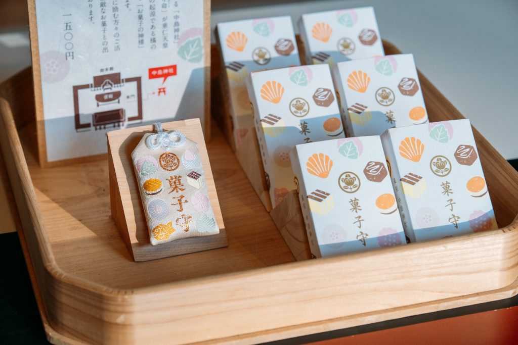 そして、御朱印をいただいた後、お菓子の神様「菓子守」を見つけました。お菓子の絵の刺繍が施された可愛らしいお守りで、製菓業に励む方々のご活躍とご繁栄、すてきなお菓子と出会えることを祈願したお守りだそうです。