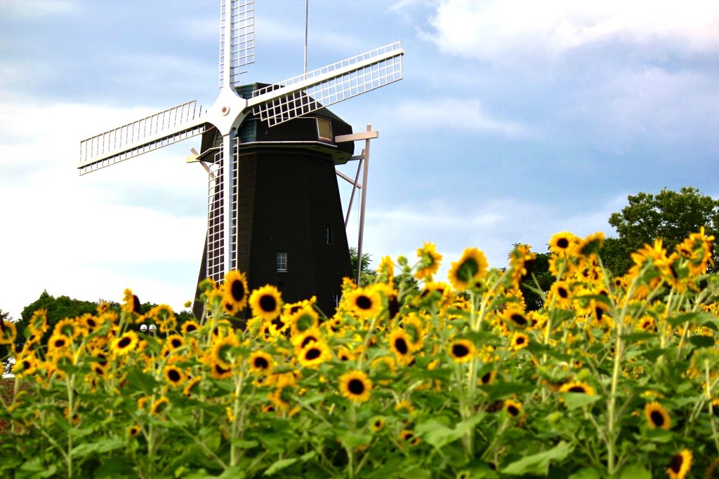 風車がある場所に到着すると、インスタ映えする美しい景色が広がっていて、ひまわり畑は見頃を迎え、多くの人々でにぎわっています!