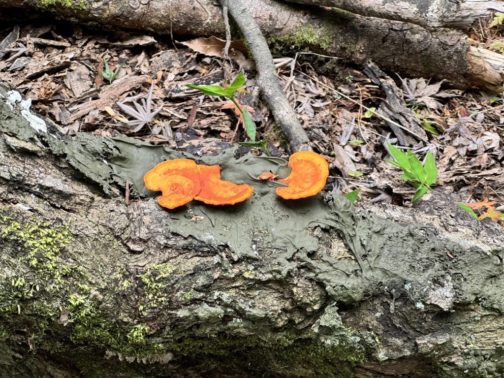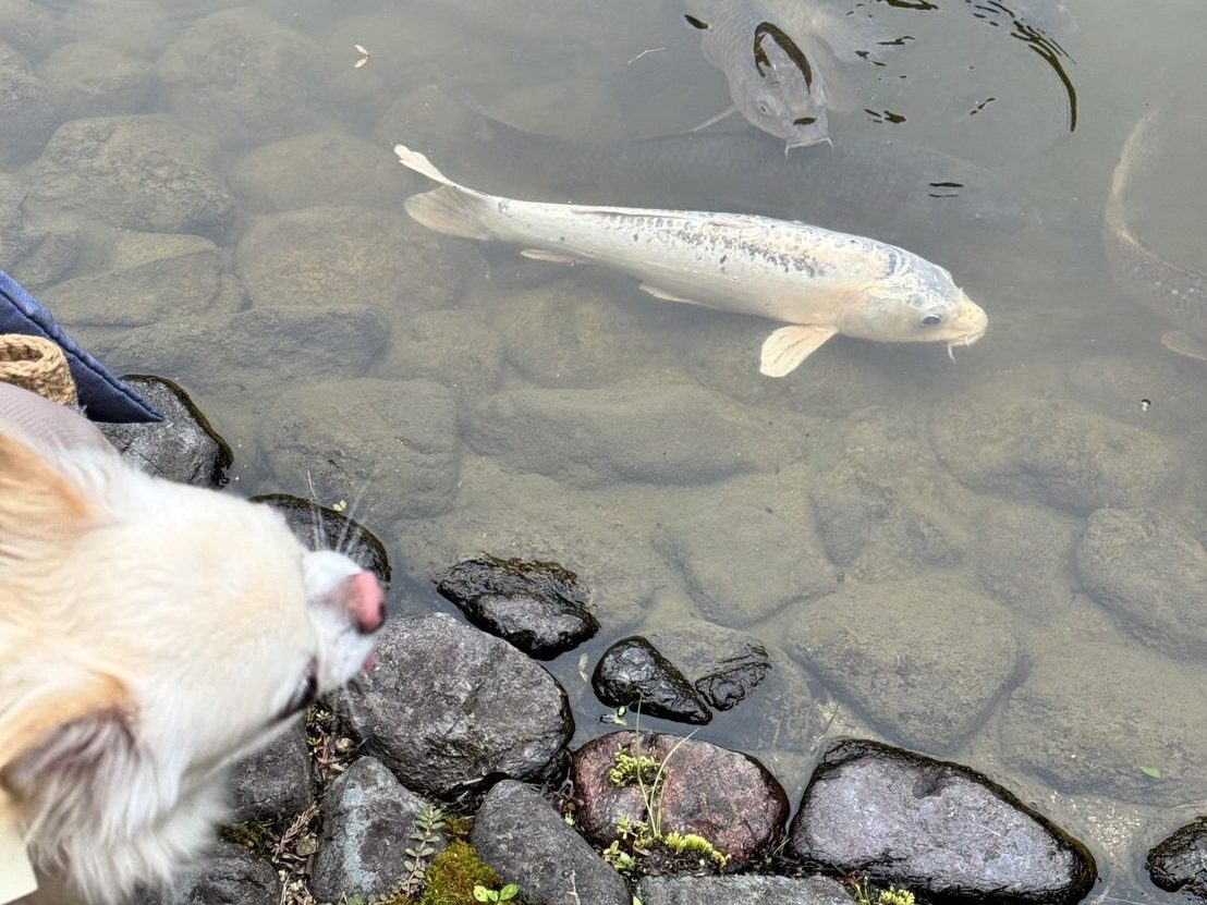 阿弥陀堂から引き返し、バン字池へ。愛犬は、池で泳ぐコイに興味津々。ちなみに私は、バン字池付近で見つけたオレンジ色のキノコが気になり、Google検索をして楽しんでいました。