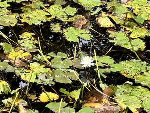 朱雀池では小さい白い蓮の花が所々で咲いています。